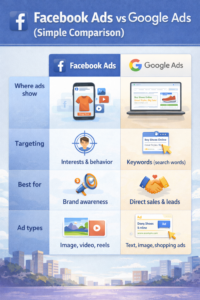 ⚖️ Facebook Ads vs Google Ads (Simple Comparison)