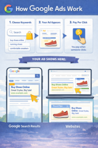 Google Ads is an advertising platform where your ads appear on Google search results and across websites.